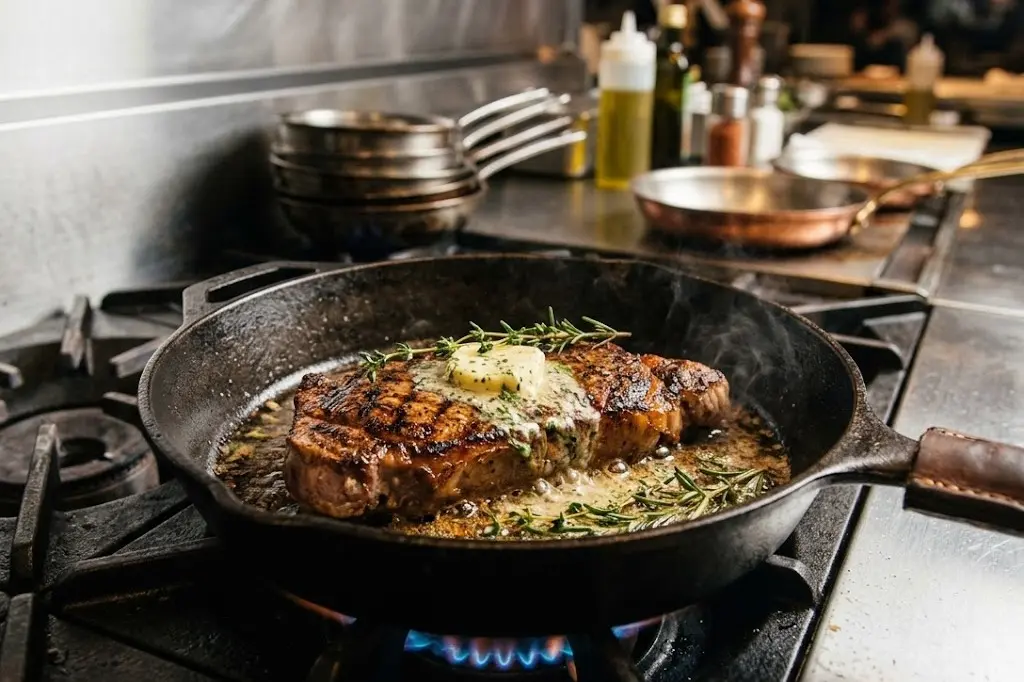 "The 'Pro Move' in any high-end steakhouse isn't just the sear—it's the Arrosé. As the steak finishes, we toss in a massive knob of cold, unsalted butter. As it foams, we spoon that nut-brown liquid over the meat repeatedly. It adds a silken mouthfeel and a layer of richness that a grill alone can never replicate." — ISU Culinary Team